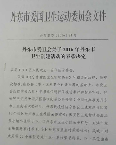 在丹東市愛國衛生運動委員2016年衛生創建評比活動中,金海·溫泉小鎮經過市愛衛會的現場考評和材料審核,從參評的數十家小區中脫穎而出,榮獲“丹東市衛生小區”稱號。