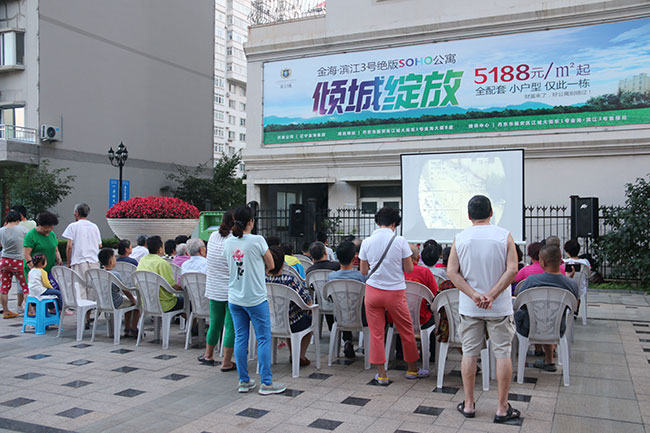 經(jīng)營中心置業(yè)顧問也在現(xiàn)場給觀看電影人員贈送電影兌換券,此兌換券可以到濱江3號售樓處兌換電影票一張。