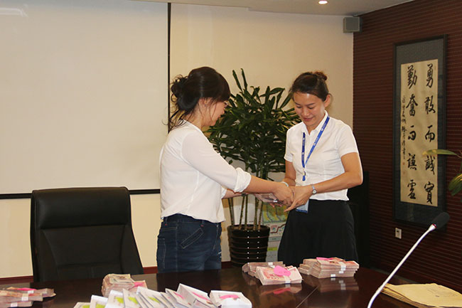 9月8日下午,經營中心宣布召開銷售會議,會議由集團常務副總經理莫丹主持,濱江3號、溫泉小鎮、金海瀾山全體銷售人員參與會議,就在大家準備認真做好記錄的時候,呈現在大家面前的是幾十萬元的現金。