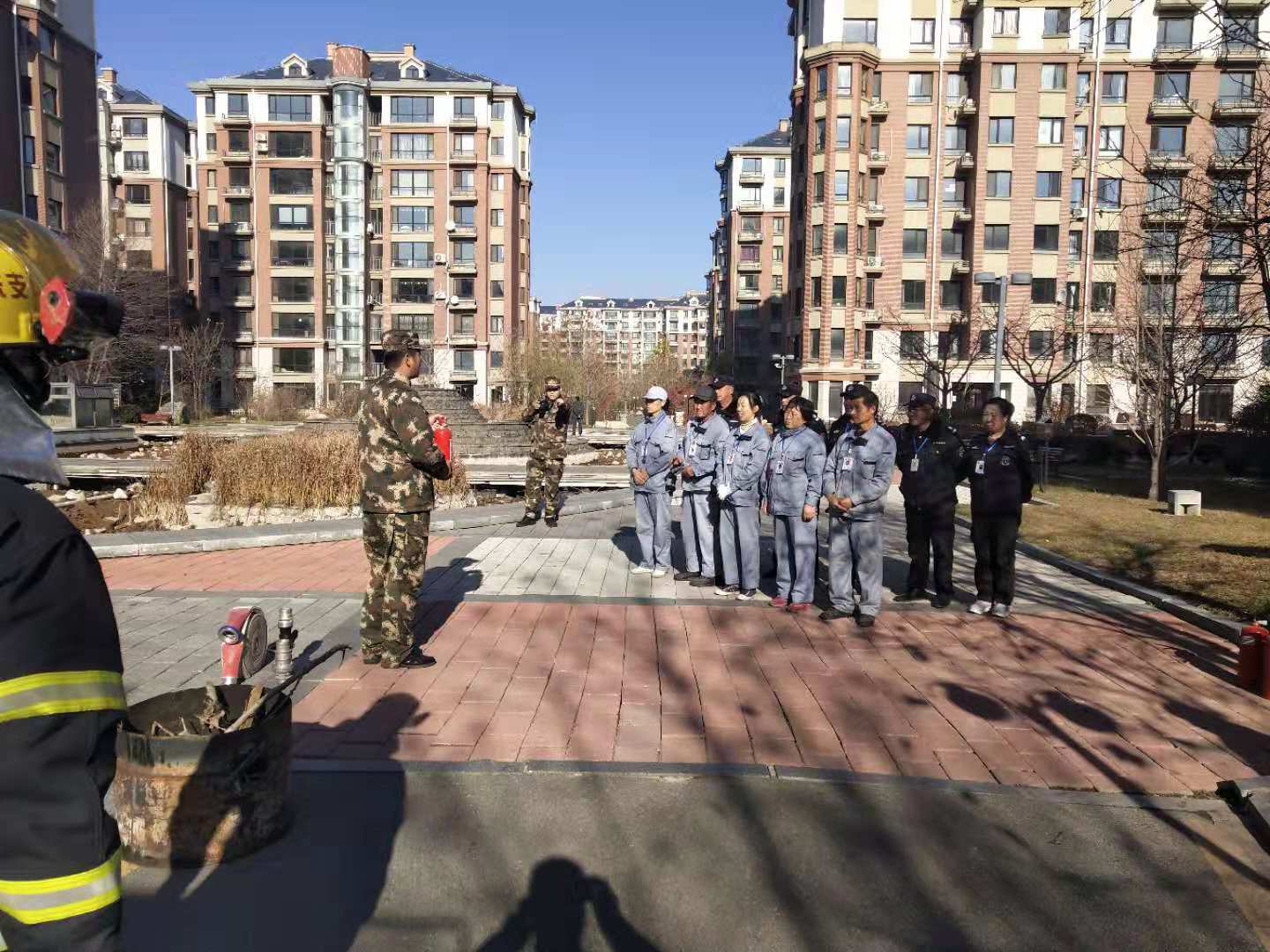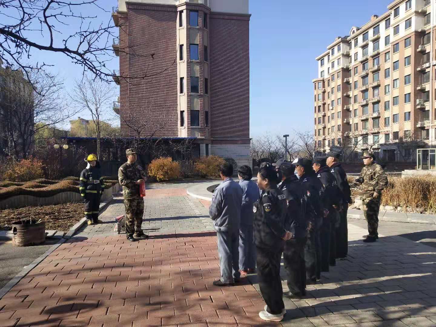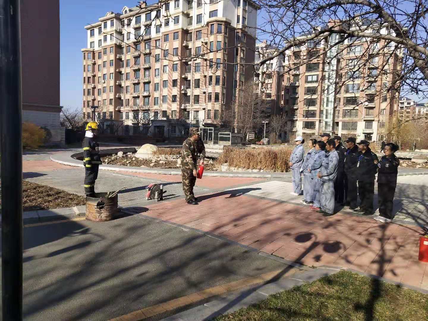 繼11月12日江畔花園消防知識培訓后,14日上午物業公司又組織溫泉小鎮管理部進行消防培訓。特聘請振安區五龍背消防中隊,在園區中央噴泉空地,開展消防培訓及消防演練。
