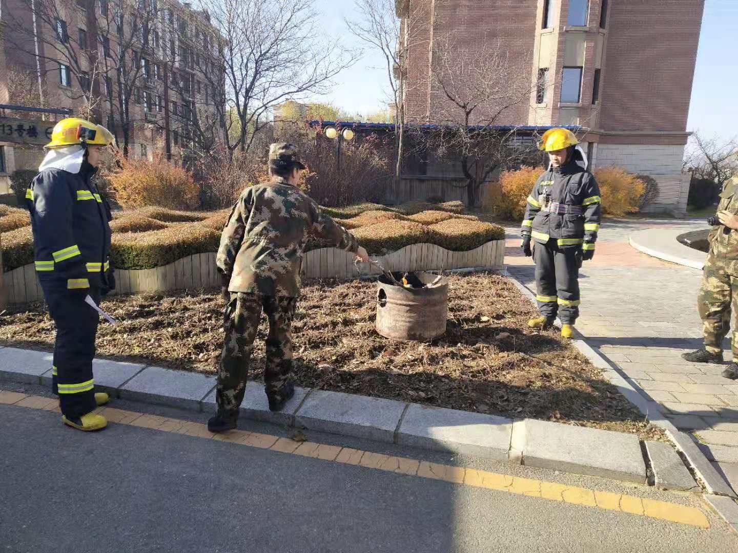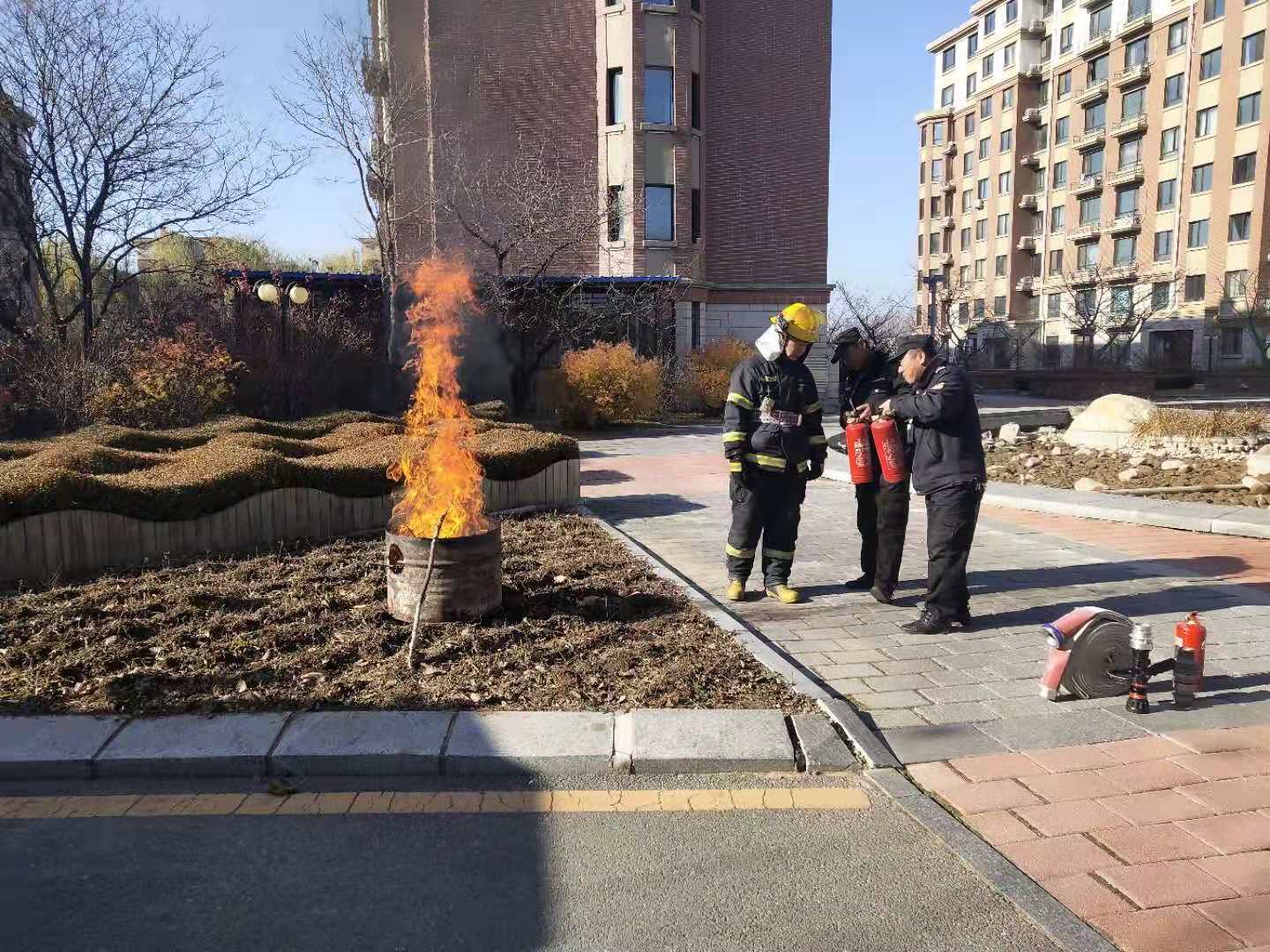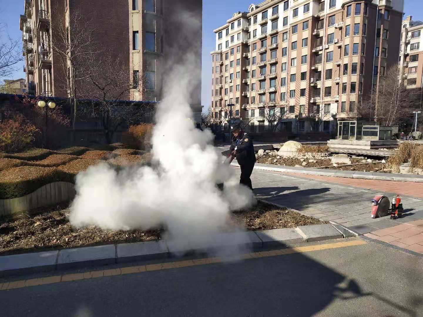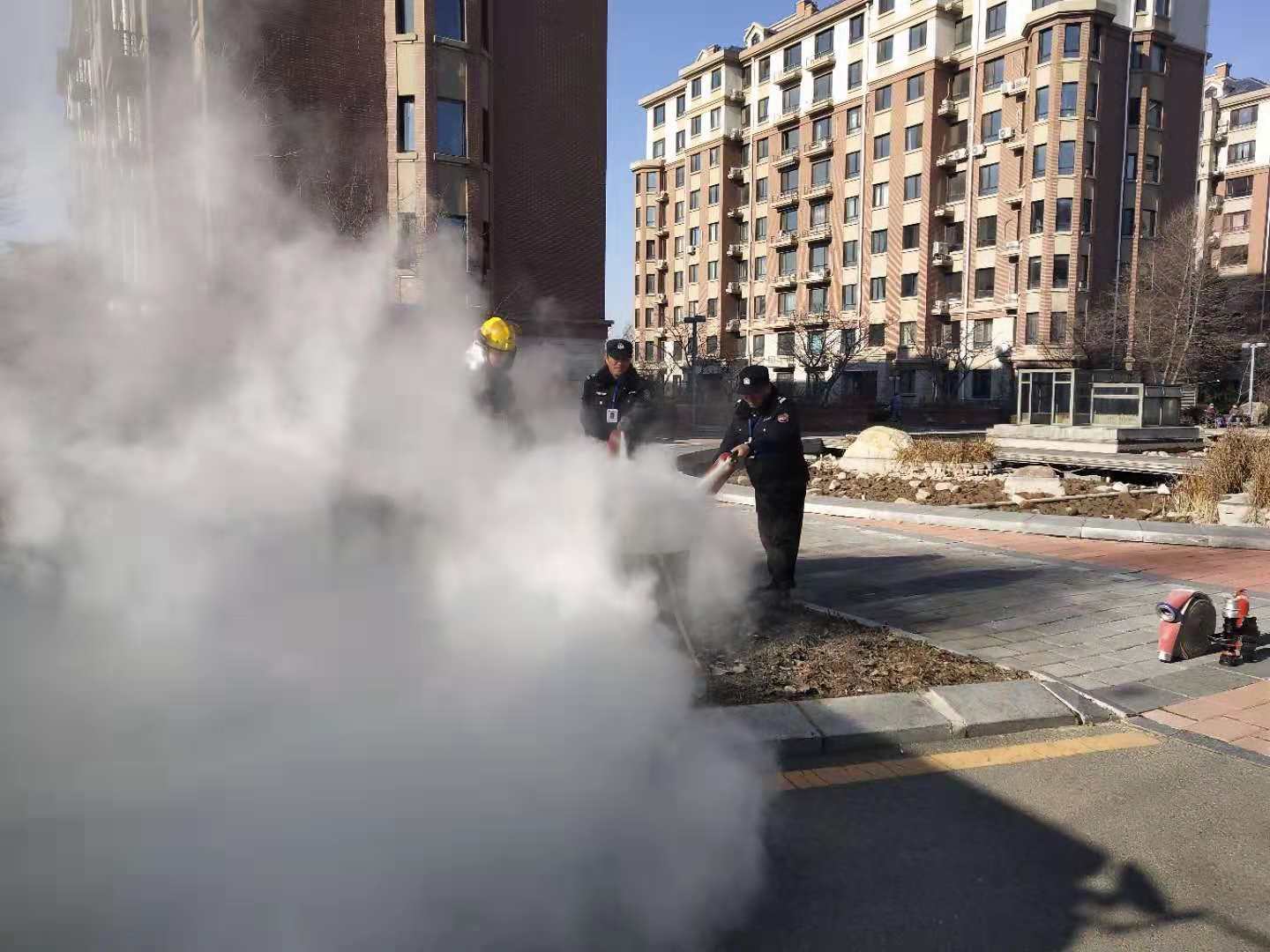 繼11月12日江畔花園消防知識培訓后,14日上午物業公司又組織溫泉小鎮管理部進行消防培訓。特聘請振安區五龍背消防中隊,在園區中央噴泉空地,開展消防培訓及消防演練。