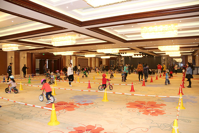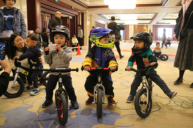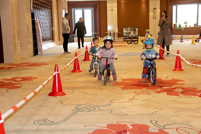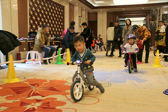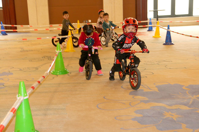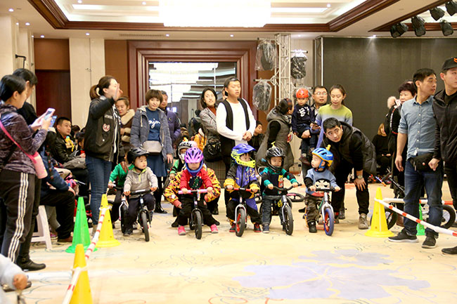 比賽開始了,1-5歲的小朋友們在比賽中一顯身手,現場有專業教練指導寶寶們體驗騎行。寶寶們一點都不膽怯,前仆后繼,很快熟悉了滑步車的技巧,飛快地通過一個個彎道。現場氣氛非凡,圍觀的家長們也為小朋友們加油。