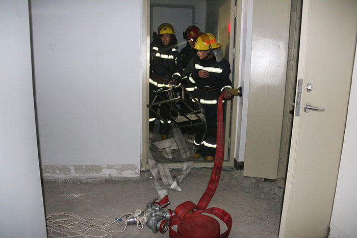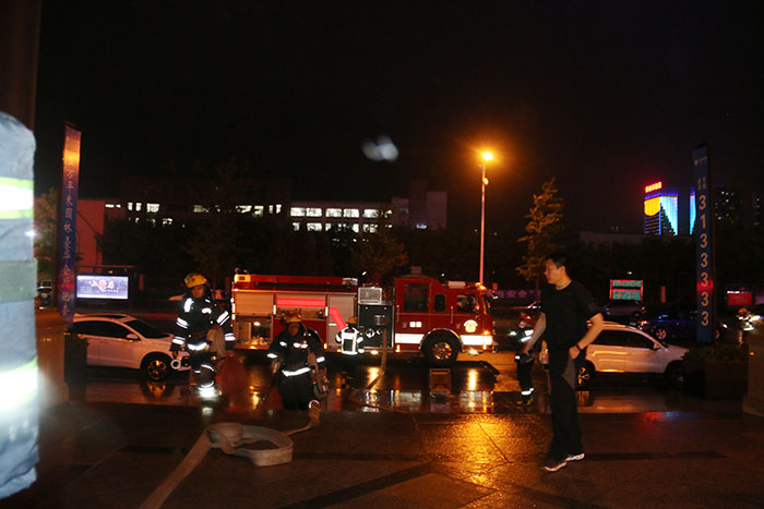 晚上8點演練在大廈門口正式開始,現(xiàn)場總指揮由消防救援支隊參謀長趙凱特、指揮長王永旭全程指揮,演練共分為:室內(nèi)救援、高層布設水袋、高空救援等課目。