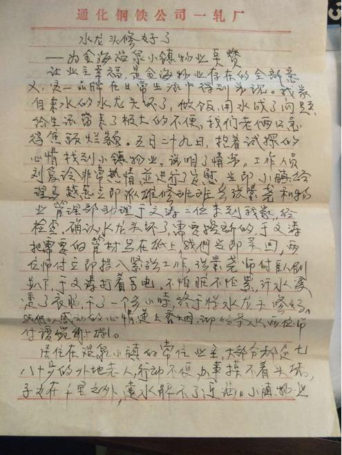 我是溫泉小鎮30號樓的業主劉桂芳,我家自來水水龍頭壞了,做飯用水成了問題。給日常生活帶來了極大的不便,我們老倆口兒急得焦頭爛額。5月29日,抱著試探的心情找到金海溫泉小鎮物業,說明了情況。接待我們的工作人員劉愛玲非常熱情,一邊安慰我們,一邊把情況向上匯報。當即,物業經理馬越惠立即派維修班班長張景堯和物業管理部綜管員于文濤來到我家。經檢查,是我家的水龍頭壞了,需要更換新的。余文濤把需要的管材寫在紙上,我們立即買回,兩位師傅立即投入緊張工作,張景堯師傅臥倒趴下、于文濤打著手電,不怕臟、不怕累、汗水浸透了衣服維修了一個多小時,終于將水龍頭修好。我們懷著感動的心情,遞上香煙、沏好茶水,卻被兩位師傅婉言謝絕。