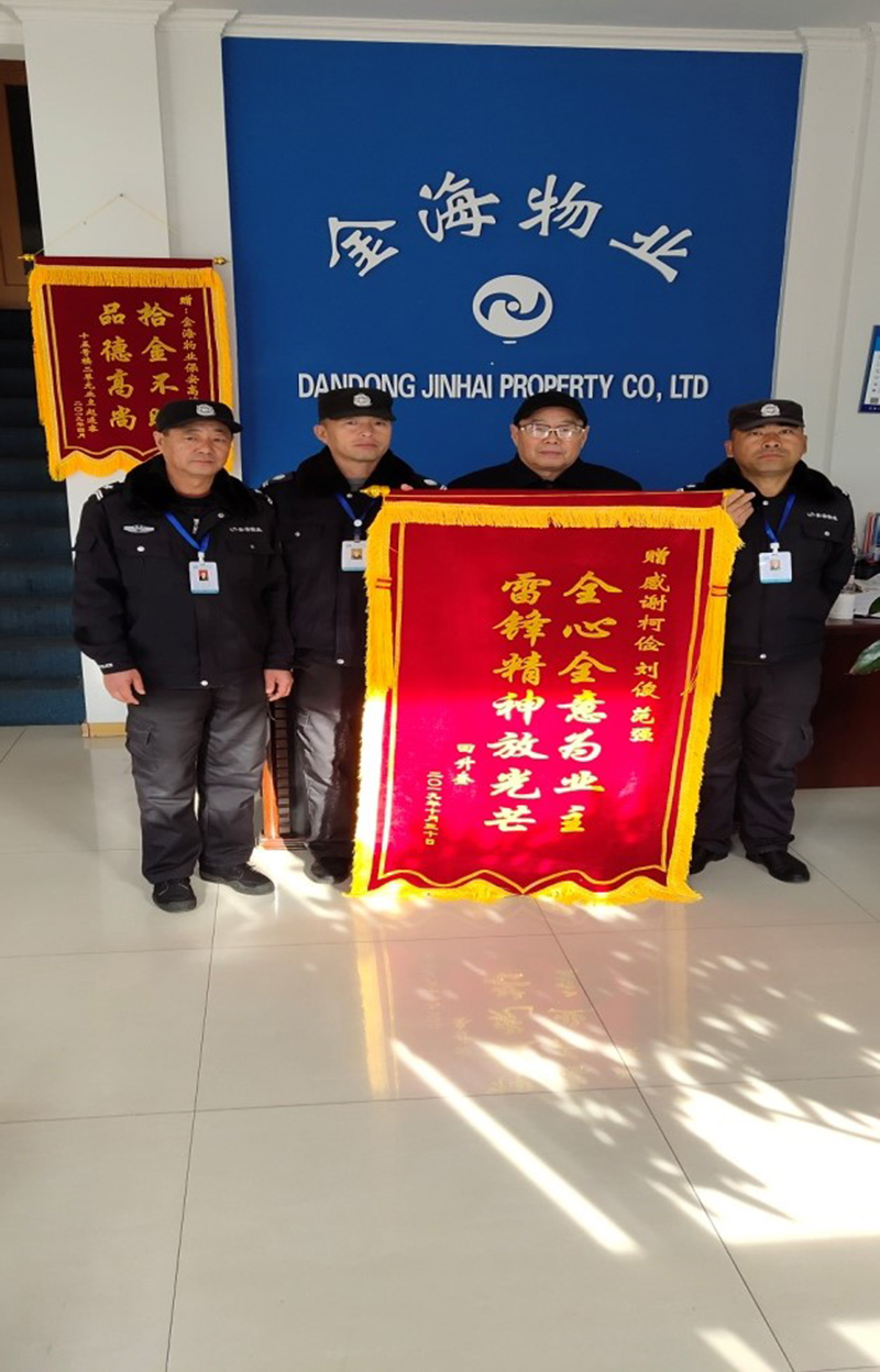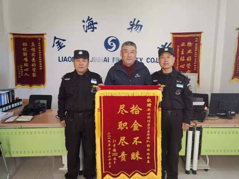 第二天,郭進班長吩咐各崗執勤保安,如果看到業主,一定要提醒他去取回錢包。在大家的努力下,業主在第二天上午就取回了丟失的錢包。業主對金海保安員的感激之情溢于言表,給新世紀佳園管理部送來了錦旗,表達錢包失而復得的激動心情和感激之意。