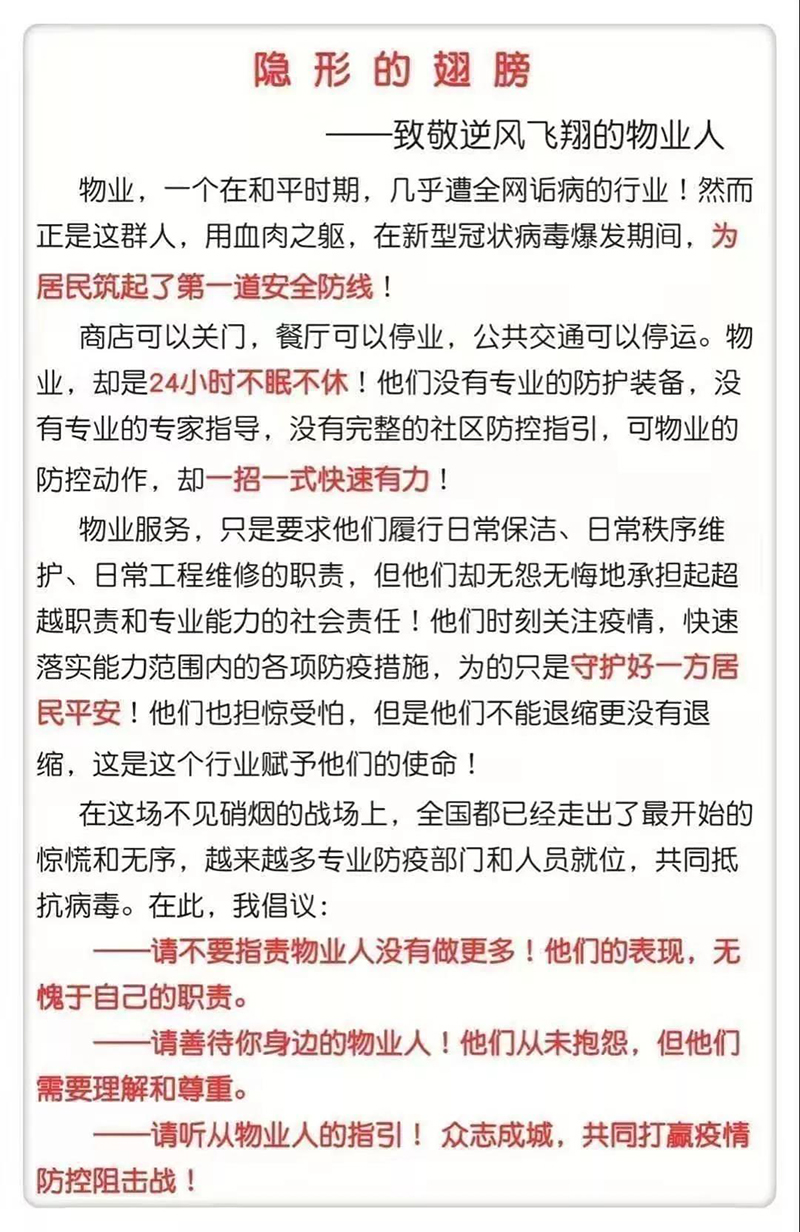 也向所有在這個特殊時期,奮戰(zhàn)在物業(yè)崗位上的工作人員們,致以深深的敬意!