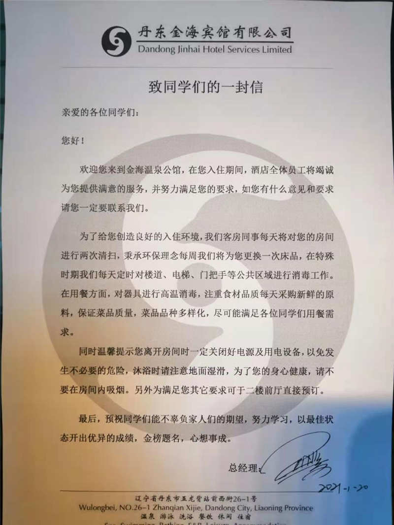 又是一年臨近春節,新冠肺炎疫情再次爆發,給各行各業造成了不小的沖擊,然爾,金海溫泉公館在這個特殊時期卻迎接了一批“特殊客人”——高考學生。來了,就是丹東人,要讓住在這里的孩子們感受到丹東人的溫暖,金海人的溫暖,這是金海公館這次重要接待的服務口號。